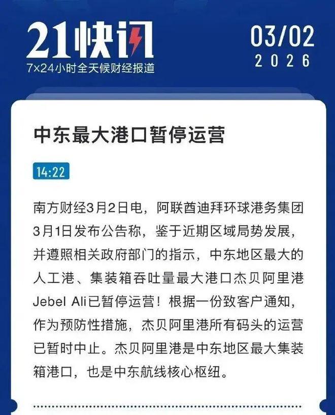 3月1日,中东最大的集装箱港口之一杰贝阿里港,因防空拦截碎片坠落引发火情,宣布暂停运营。虽然后续很快恢复,但这场短暂的停运,已经引发了连锁反应。