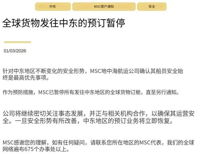 航运公司的避险动作,进一步放大了冲击。MSC暂停全球至中东新订舱,马士基航线绕行好望角,单程多走5000海里,时效延误20天。