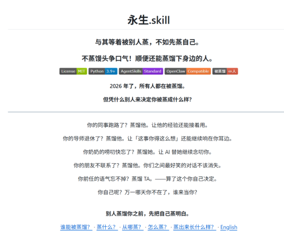 很快,“前任.skill”、“老板.skill”、“导师.skill”、“暗恋对象.skill”乃至“永生.skill”等衍生项目相继涌现,形成了庞大的Skill宇宙。