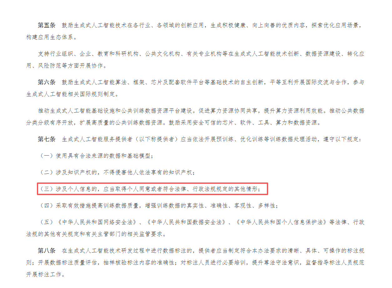 依据《生成式人工智能服务管理暂行办法》,训练活动涉及个人信息的,应当取得个人同意或符合法定情形。