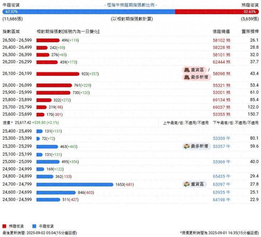 中信证券牛熊证街货分布图中的数据显示,熊证街货重货区在26100-26199区间,该区间最新熊证数量为923张,较上一交易日增加357张;熊证街货最多新增在相同区间。