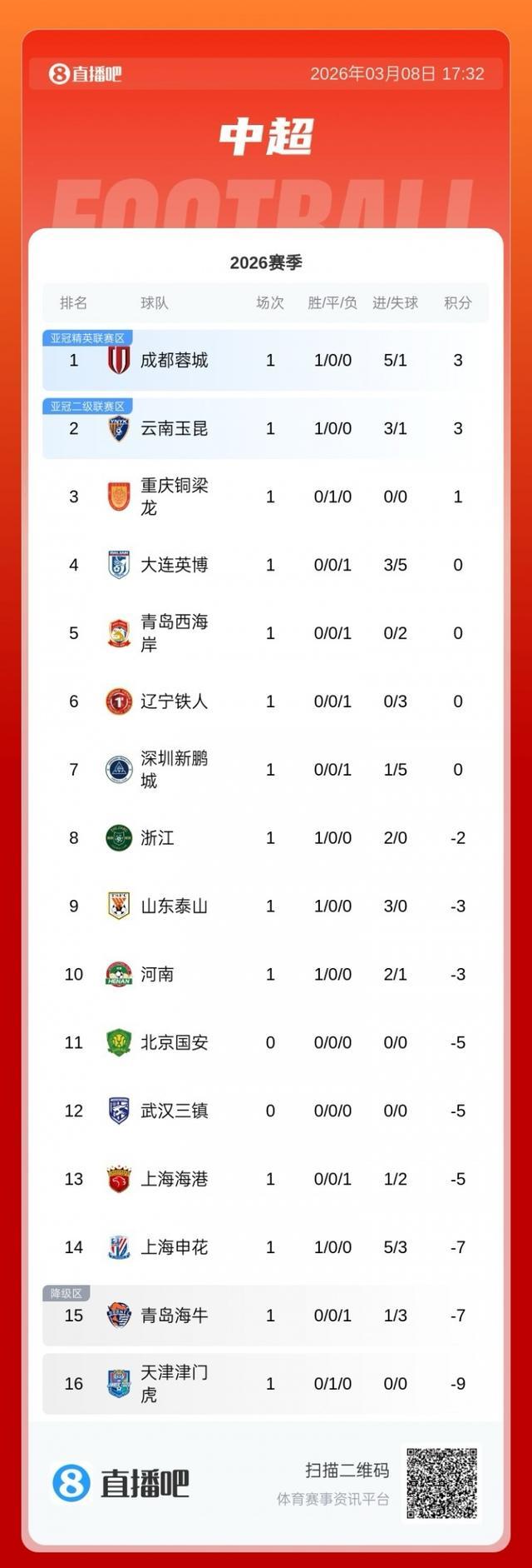 股票配资怎么开户 中超积分榜:浙江开门红负2分暂列第八,西海岸0分暂列第五