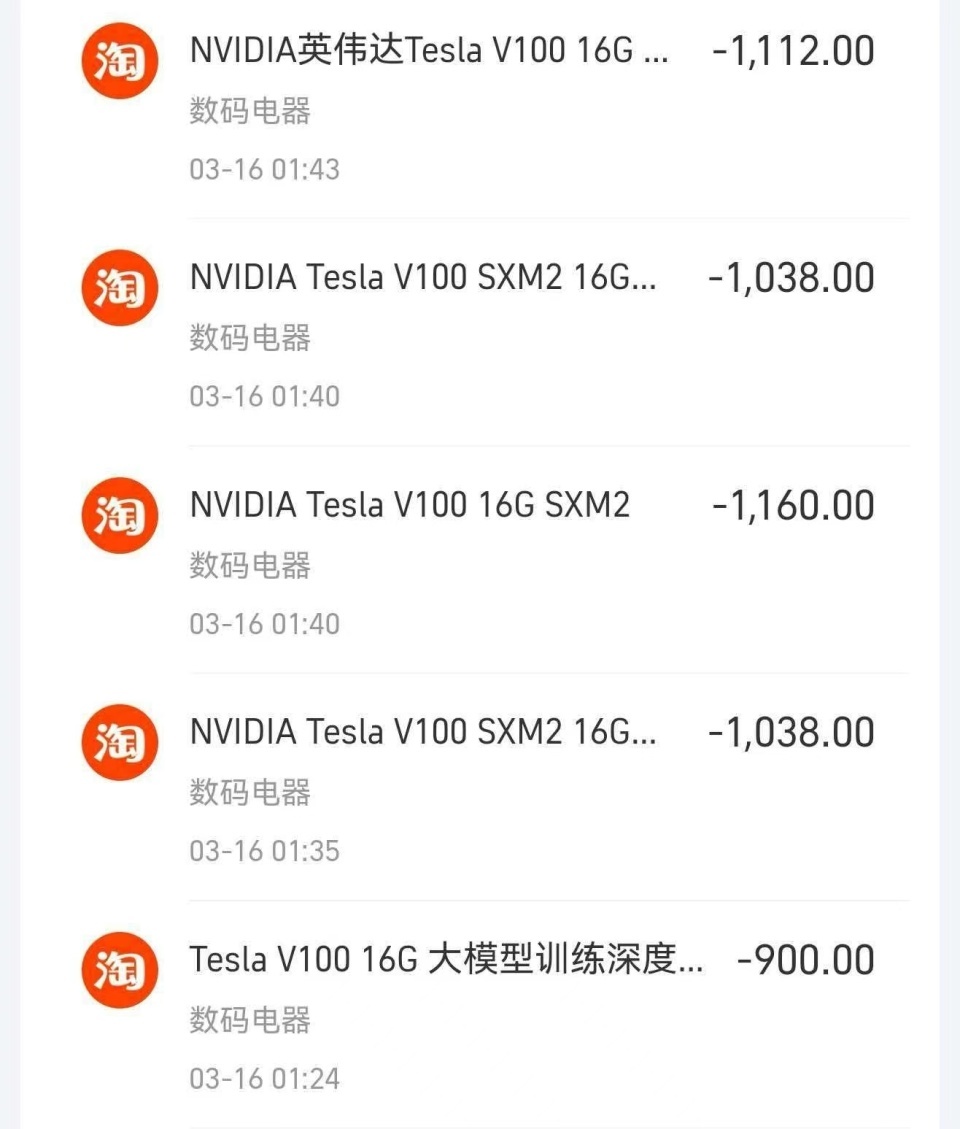 部署集群,显卡是关键项,但这些显卡并非市面上常见的消费级显卡,而是英伟达P100、V100(32GB)等专门用于AI大模型训练的计算卡。王先生说,这类计算显卡仅进行数学运算或文字处理,不负责图像画面处理,因此在配置和价格上比常见显卡便宜不少,二手货也可满足需求。今年3月中旬,王先生陆续在淘宝平台的五个店铺,下单购买了15张计算用显卡,总价万余元,其中不少是二手货。