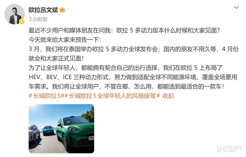 【太平洋汽车 新车频道】3月4日,长城汽车欧拉品牌总经理吕文斌表示,长城欧拉5的多动力版本将在4月正式上市。欧拉5布局了HEV(混动)、BEV(纯电)、ICE(燃油)三种动力形式,纯电版本此前已经上市,而燃油和混动版车型也于欧拉5纯电版发布会上实车亮相。