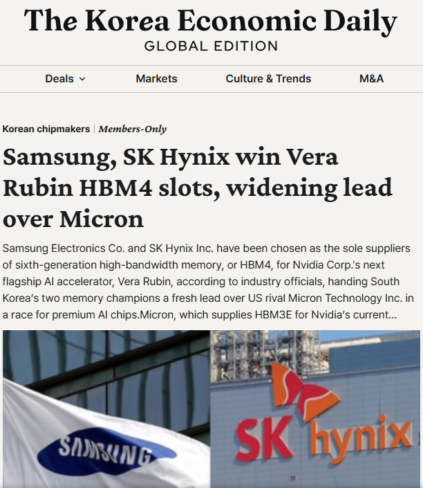 3月9日,据《韩国经济日报》独家报道,英伟达下一代AI加速器Vera Rubin的核心供应链悬念正式揭晓。作为这款重磅产品的“算力基石”,第六代高带宽内存HBM4的供应商名单尘埃落定,三星电子与SK海力士成功突围,携手拿下核心供应资格,而全球第三大内存厂商美光则意外暂别顶级供应链,半导体行业的高端内存争霸赛迎来关键转折点。