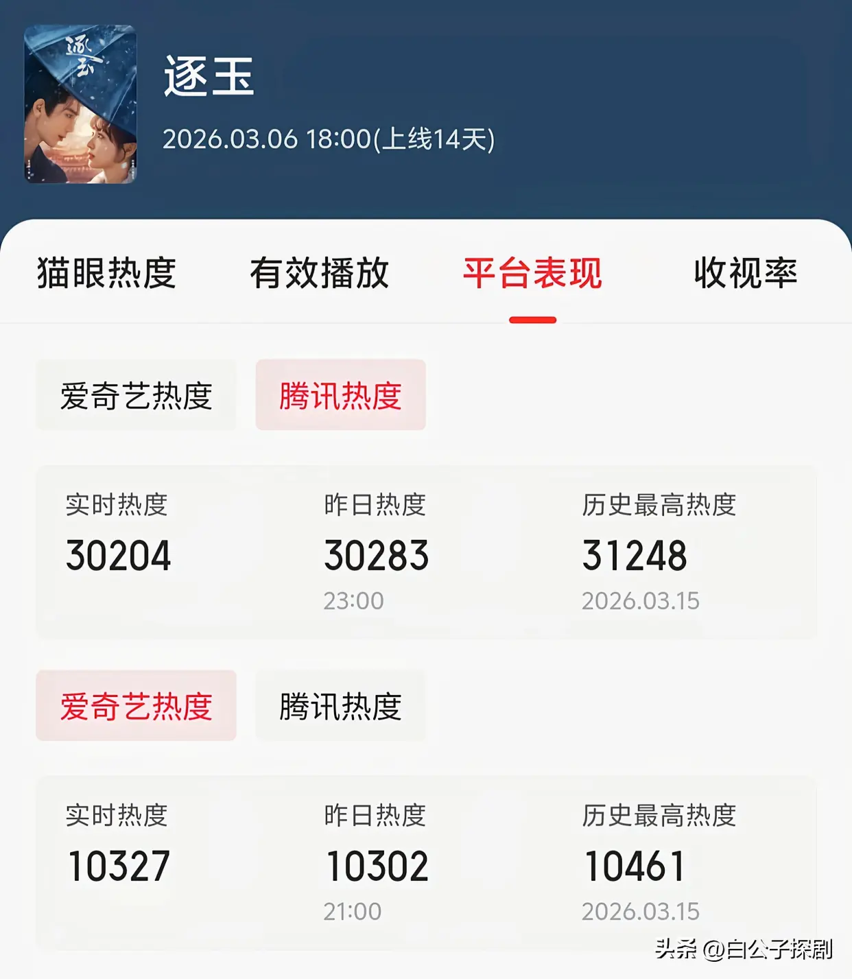 《逐玉》上线14天,首日就口碑直接爆棚,热度也成功实现双平台破万。